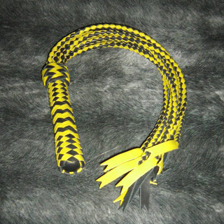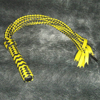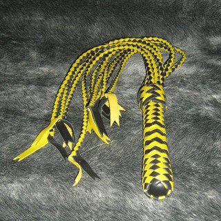 Кошка изготовлена из натуральной кожи черного и желтого цвета. Девять хвостов с длинными кончиками позволяют легко наносить сильные и точные удары по телу раба или рабыни. Кошка хорошо сбалансирована, а специально подобранная форма рукояти девайса обеспечивает легкое управление во время процесса порки.